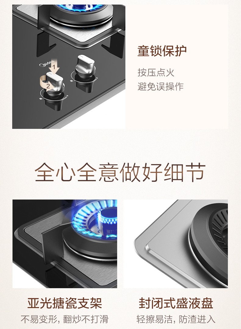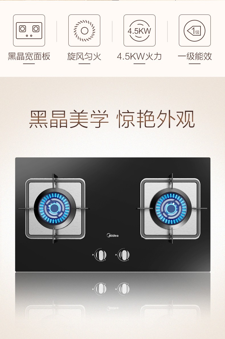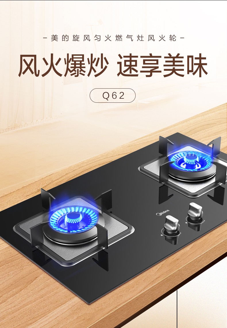 美的(Midea)一级能效4.5大火力燃气灶Q62 嵌入式燃气炉具灶具 钢化玻璃双灶台 钢化玻璃 天然气